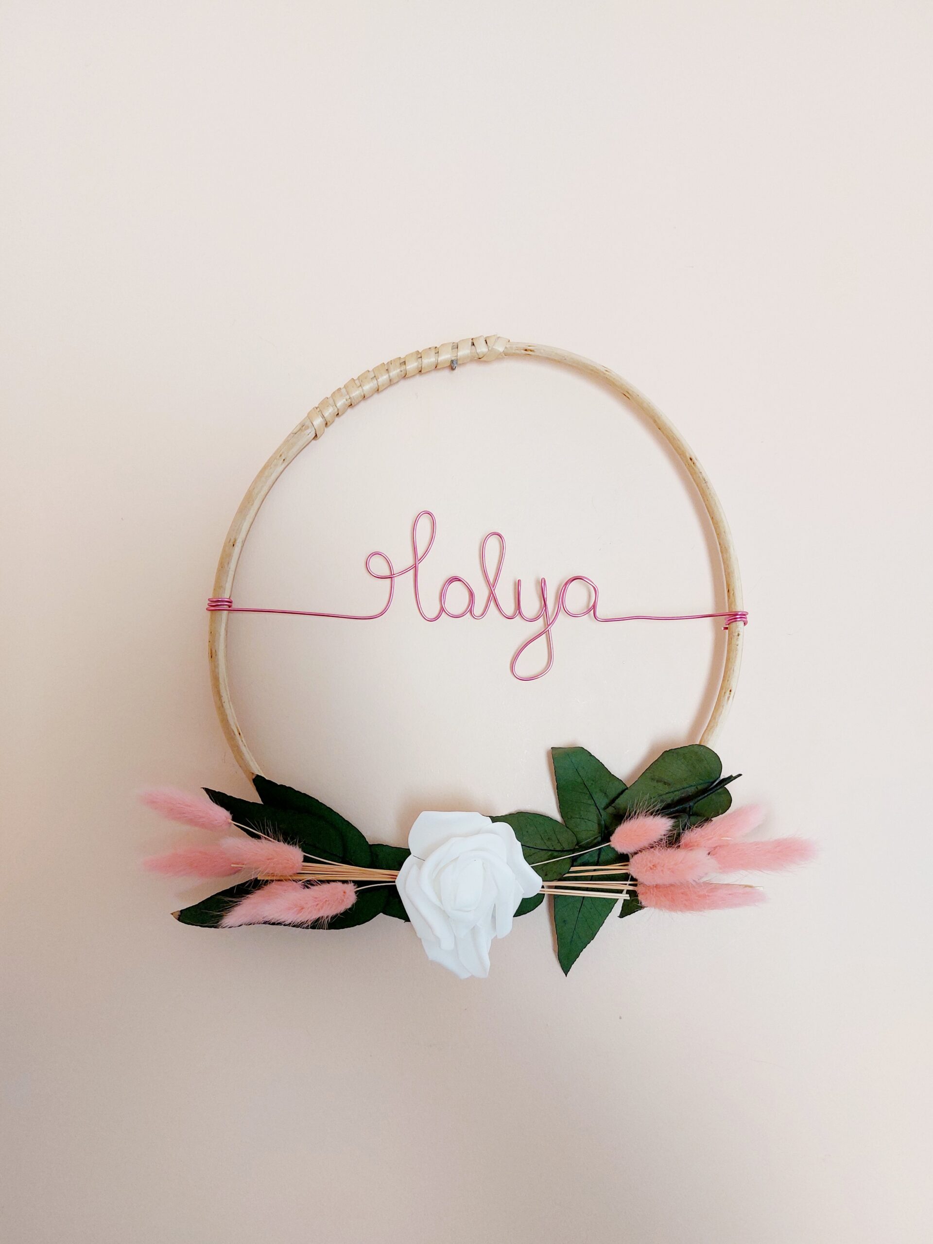 La couronne de fleurs personnalisée apportera une touche de douceur pour décorer la pièce que vous aurez choisi de votre maison. Elle est composée d’un cercle en tricotin et de fleurs séchée.