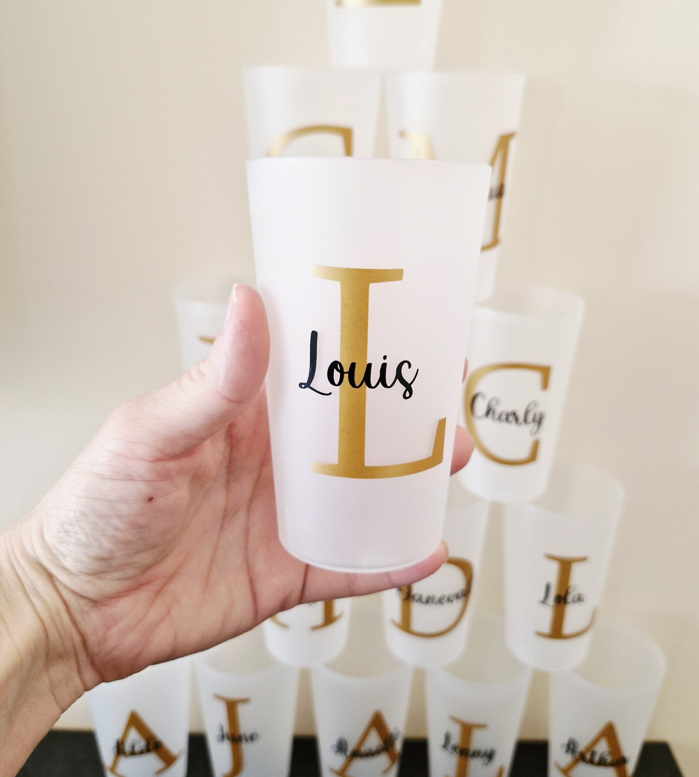 Gobelet personnalisé et réutilisable. Une idée originale pour garder un petit souvenir d’une journée particulière sans bisphénol A .