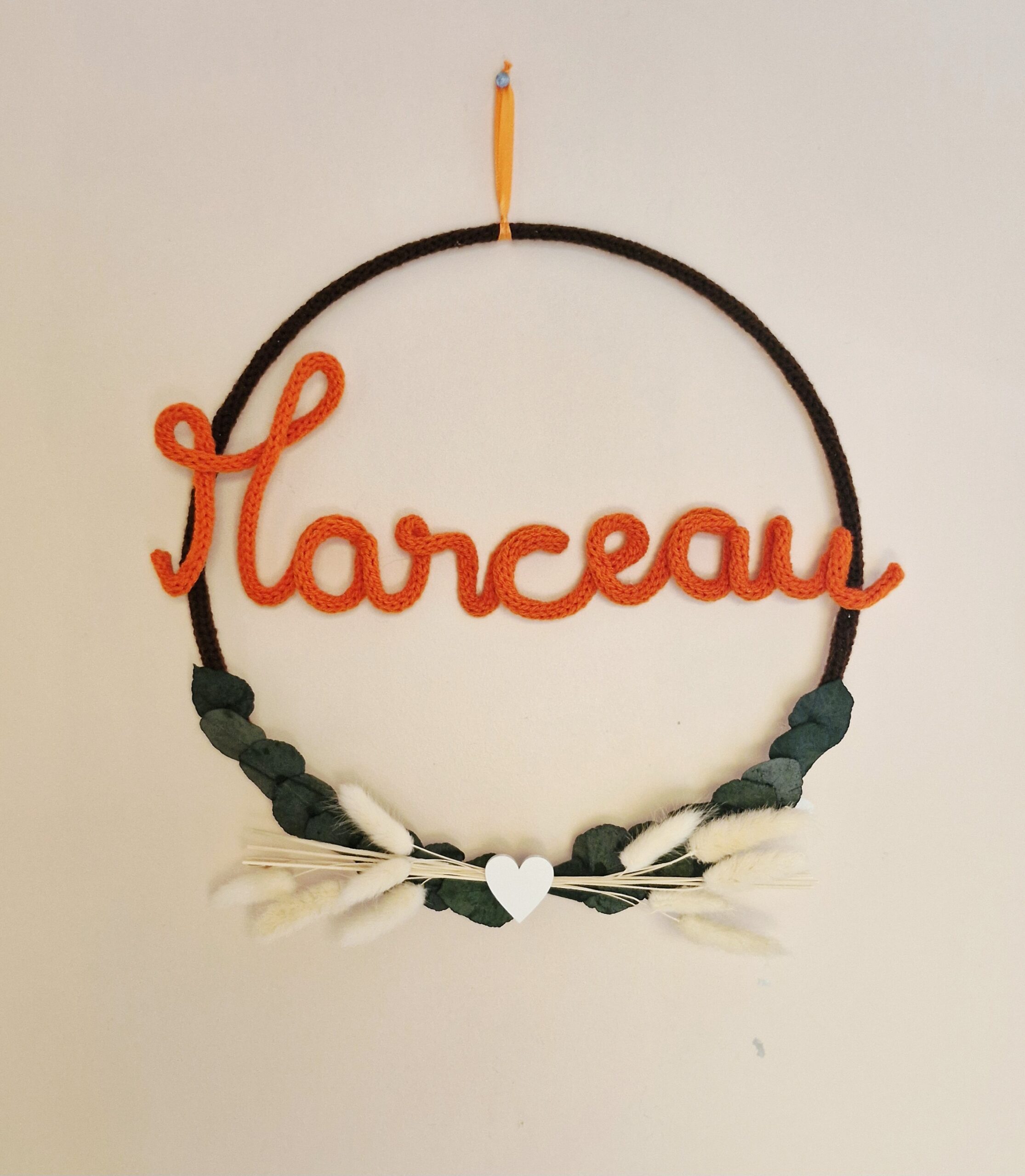 La couronne de fleurs personnalisée apportera une touche de douceur pour décorer la pièce que vous aurez choisi de votre maison. Elle est composée d’un cercle en tricotin et fleurs séchées.